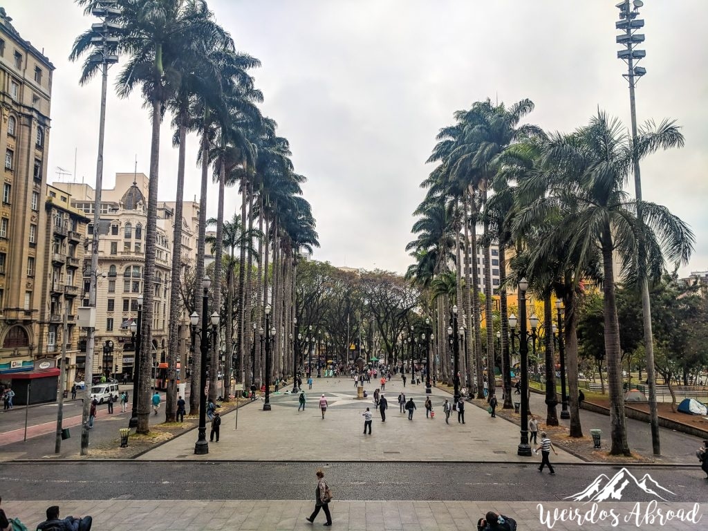 The heart of Sao Paulo, or the point zero, is in front of the beautiful Metropolitan Cathedral of São Paulo, a relatively modern structure. Don’t hesitate to visit it: the stained windows are beautiful and the pillars are massive! We were surprised by the absence of paintings, especially on the ceiling, which is not very common in the Cathedrals we have recently visited across Europe.