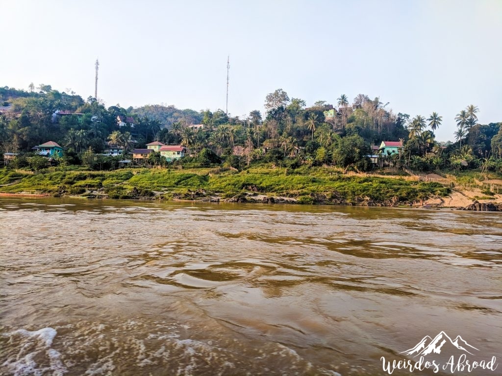 The second boat was a bit smaller so we had less space to turn around seats but it was still pretty comfortable. The landscape looked very similar as the day before but the villages gradually got more modern and the “jungle” less dense. For the last leg of the trip it was funny to consider that we were cruising along the border: on your left Laos, on your right Thailand! And we could already notice than Thailand is more developed.